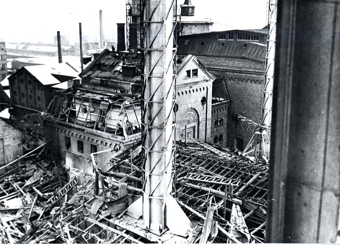 I januar 1945 sprængte blev Tuborg Bryggeriernes maskinhus og kedelhus sprængt i luften. Det skete som en gengældelsesaktion mod den danske modstandsbevægelses angreb på den tyske besættelsesmagt (såkaldt schalburgtage). Foto fra januar 1945.